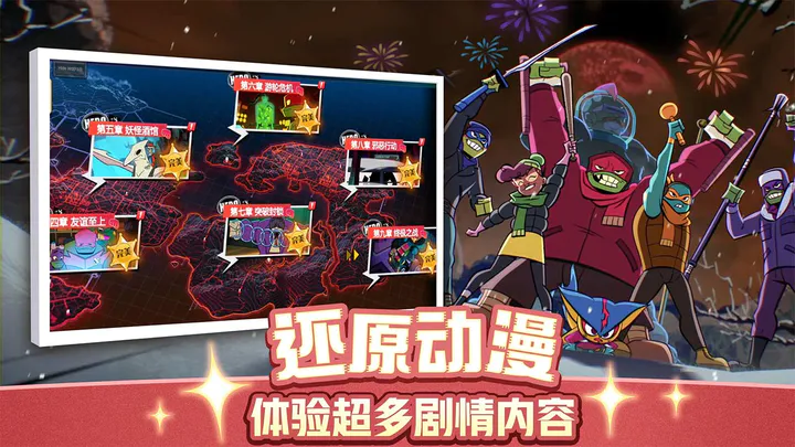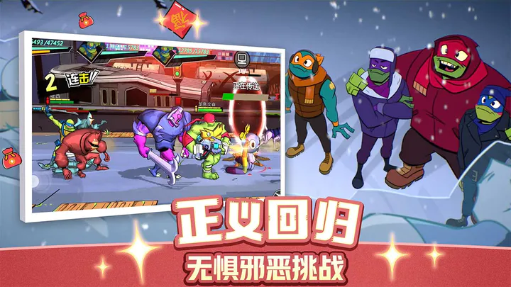 “Ninja Turtles: Homecoming” is a classic arcade adventure fighting mobile game authorized by Ninja Turtle.The ninja turtles appeared strongly and began their new adventure. Ercorlazel became the captain of the four turtles., Donatro and Michelangelo explored New York, using mysterious ninja power to fight new villains.The game restores the classic arcade gameplay. Each ninja turtle has its own different weapons, moves, and skills. It is committed to bringing players a childhood original combat experience.The favorite turtles defeat the enemy to save the world.