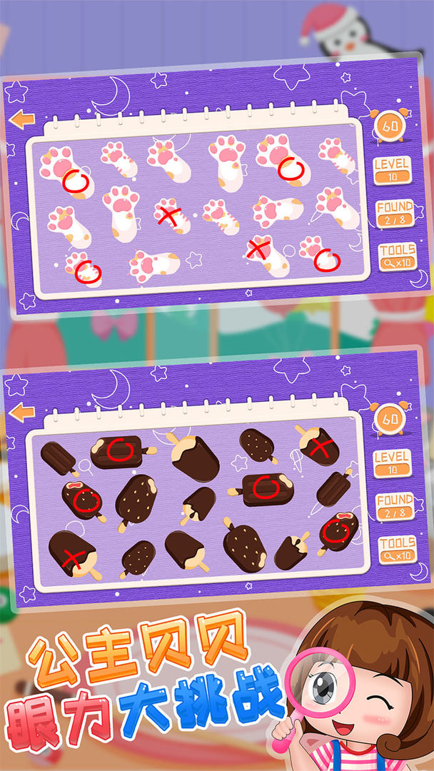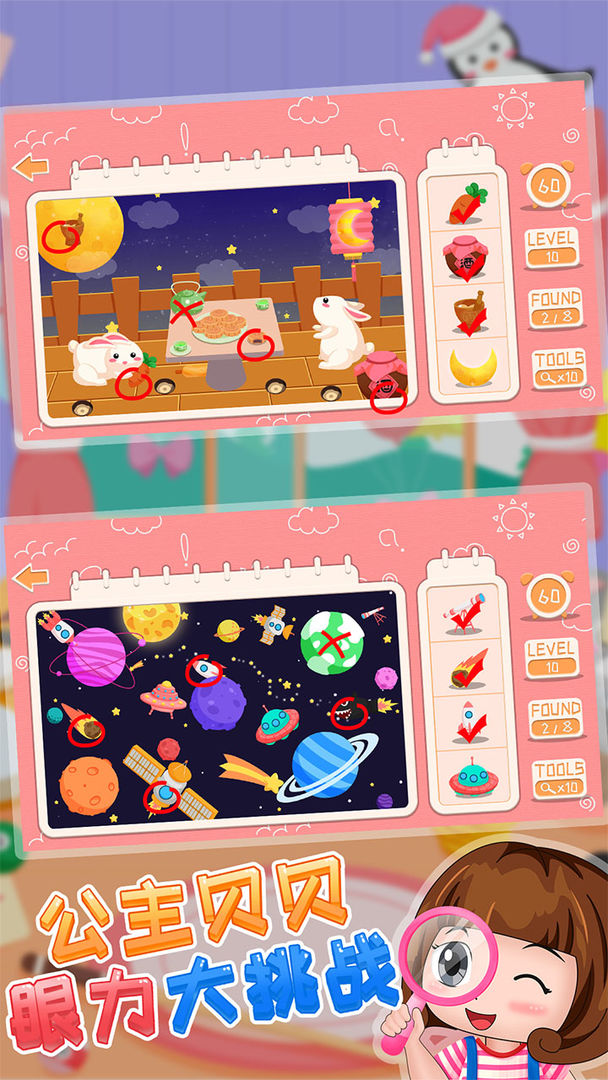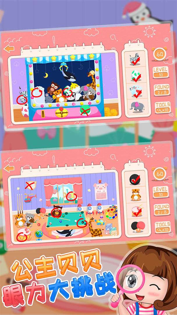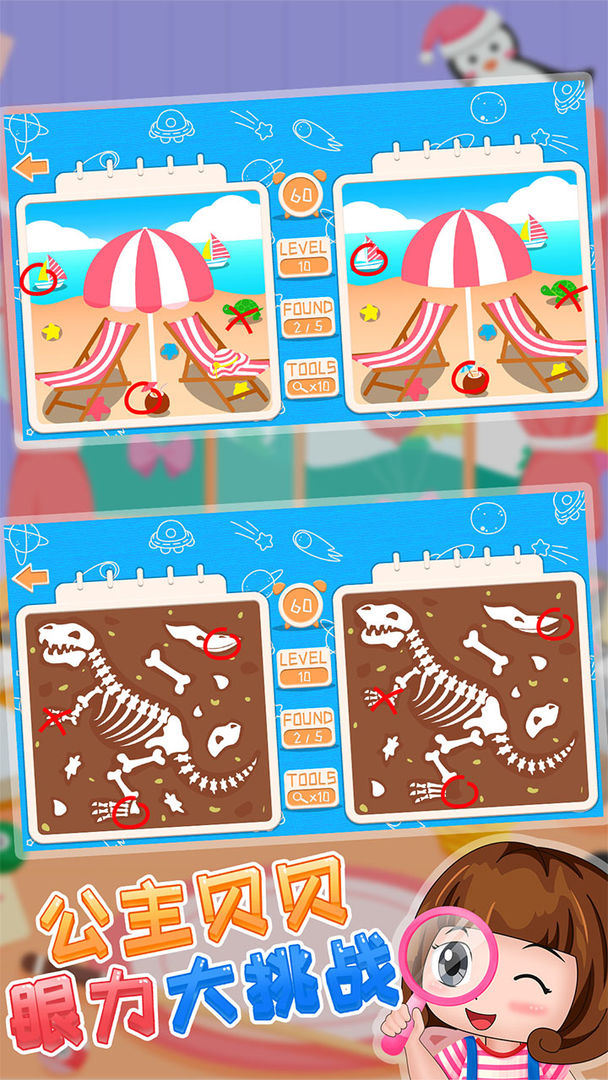 Princess Beibei Eyesight Challenge is a stand-alone early education software for children's enlightenment, leisure and intelligence, which combines various interesting collections of pictures, including finding differences, finding the same and finding different ways to play. Exercise children's hands-on ability, and develop their brain and intelligence in an all-round way. This software accommodates children’s brains to find the difference by looking at pictures and fun educational content for children. The content is vivid and interesting, allowing children to exercise their concentration and concentration while playing the game of finding the difference.